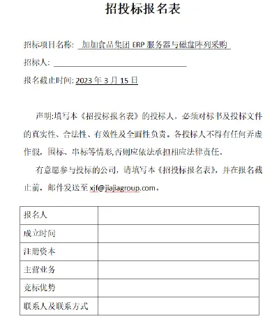 2. 报名截止时间: 2023年3月15日。3. 招标联系人:许先生 15084982678有意愿参与投标的公司,请填写《招投标报名表》,并在报名截止前,邮件发送至_xjf@jiajiagroup.com__。